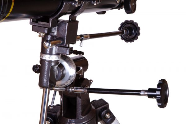 Оптическая труба телескопа установлена на экваториальную монтировку, которая хорошо подходит для изучения космоса. На освоение управления требуется время, но ведение астрономических объектов происходит просто и удобно. У монтировки плавный и мягкий ход, оптическая труба крепится надежно и прочно. Тренога сделана из алюминия, высоту ее ножек можно настраивать под рост наблюдателя. Есть лоток для аксессуаров.