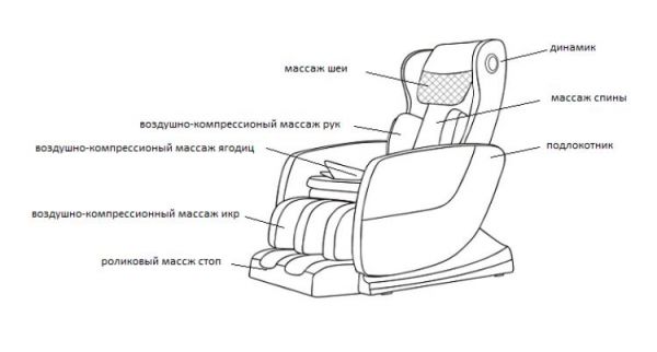 Кресло включает четыре управляемых массажных колеса, подвижную массажную группу в спинке кресла, включающие массаж шиацу (точечное воздействие на некоторые зоны, достаточно ощутимое давление на эти точки), воздушно-компрессионный массаж, разминающий массаж.